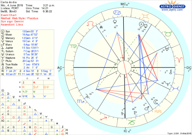 Hoje é mais fácil ver o que nos interessa não só como indivíduos mas como grupo e comunicar essa lógica de forma assertiva e urgente já que o que está em jogo é o fim de uma certa segurança, rotinas, tradições por força de grandes mudanças estruturais. A Lua em Aquário em trígono ao Sol conjunto a Mercúrio em Gémeos dá o mote para esse sentir das preocupações colectivas e a expressão das mesmas de forma inteligente. Em simultâneo, Marte em Aquário oposto ao Nódulo Norte em Leão, obriga-nos a não ficar presos ao grupo mas sim a agir em nome individual pelas causas comuns. Que muita coisa está a mudar e que essas mudanças são difíceis de controlar, não há dúvidas hoje nem nos próximos dias. Vénus em Caranguejo oposto a Plutão em Capricórnio e Urano em Touro em semi-quadratura a Neptuno em Peixes são sinais claros de que os velhos valores, as tradições, os investimentos seguros estão a ser postos em causa por forças maiores e não se pode ter fantasias nem que tudo fique na mesma nem que esses novos valores não sejam contestados. Está a chegar ao fim o grande trígono de Água entre Vénus, Júpiter e Neptuno que no fim-de-semana ajudou a sonhar com mundos melhores e, ou tivemos sentido prático para construir essa nova realidade, prontos a deixar o passado para apostar em novos valores ou então, esta oposição de Vénus a Plutão pode traduzir-se em perdas consideráveis.