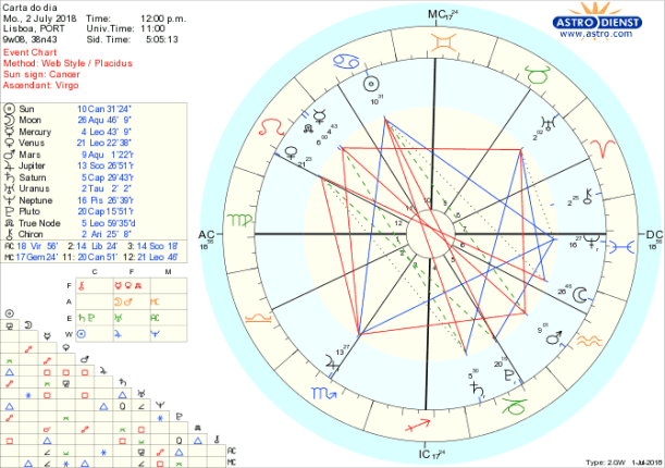 Durante quase todo o dia, a Lua ainda em Aquário leva-nos a procurar segurança no eco dos outros, das relações sociais, dos grupos de interesses idênticos e a associarmo-nos em prol de novos valores, com Urano,regente de Aquário em trânsito em Touro. Um grande trígono de Água entre o Sol em Caranguejo, Júpiter em Escorpião e Neptuno em Peixes, que se prolonga toda a semana, cria uma atmosfera emocional, fluida em que tudo o que diga respeito à casa, família, país, rotinas e tradições é alvo de sonho, projecção do que pode mudar para melhor, sensibilidade e compaixão, reforçados pela entrada da Lua em Peixes ao final da tarde GMT. Abrimo-nos também a novas perspectivas do que espiritualmente nos une com o sextil da noite da Lua a Urano em Touro. No entanto, um quincúncio de Vénus – regente do Touro- em trânsito em Leão a Plutão em Capricórnio força-nos a ser honesto na avaliação dos problemas de auto-estima, do medo de desagradar ou dificuldade em estabelecer limites saudáveis ao que damos para além da nossa capacidade real. Assim, hoje, não podemos deixar que o excesso de sensibilidade e empatia nos faça ignorar a defesa dos nossos próprios interesses, apesar de ser difícil ter uma visão fria e pragmática dado o sesquiquadrado de Vénus e o quincúncio de Mercúrio a Saturno em Capricórnio, mas há que fazer o esforço, mesmo com irritação…