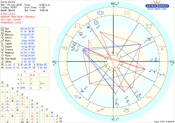 A Lua conjunta a Vénus em Virgem, trígono pela manhã a Urano em Touro e a Saturno em Capricórnio, põe o foco no pormenor do que melhor nos serve mas a sua oposição a Neptuno faz-nos oscilar entre o grande plano e detalhe, podendo fazer perder o sentido de direcção que o Nódulo Norte em Leão, oposto a Marte em Aquário,regido pelo Sol em Caranguejo, aponta como sendo o da afirmação individual do que nos dá segurança. Podemos por isso ter de discutir, investigar, aprofundar qual é realmente a lógica que temos de adoptar para garantir a satisfação dos interesses individuais, com Mercúrio em Leão em quincúncio a Plutão em Capricórnio. De facto, para sermos hoje realmente eficazes não podemos perder de vista o sonho que nos leva a fazer revoluções na vida- Neptuno em Peixes trígono a Júpiter em Escorpião – nem descurar ir ao fundo nem das questões na mesa nem dos fundamentos da nossa própria vontade. Pelo final do dia a Lua já faz trígono a Plutão e tudo parece correr sem atropelos, encontramos o ideal nos detalhes e nos detalhes o ideal..