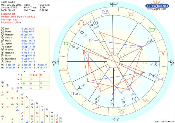 O mais provável hoje é que as grandes ideias, sonhos, idealizações virem desapontamento – com impacto na auto-estima – agora que tanto queremos brilhar… e o conflito irrompe. O Sol recém entrado em Leão, a aproximar-se de uma conjunção ao Nódulo Norte, puxa-nos para o palco da vida para mostrar-mos quem somos mas a sua quadratura a Urano em Touro e oposição a Marte em Aquário mostram que se não mudarmos de valores vamos encontrar muita oposição. Em simultâneo, a Lua em Sagitário, quadrada a Vénus em Virgem e a Neptuno em Peixes, leva também os entusiasmos a esmorecer quando sobre-estimamos os planos que idealizamos. O dia é um “reality check”, uma chamada ao real com Saturno em Capricórnio em trígono a Urano em Touro e Plutão em Capricórnio em trígono a Vénus e sextil a Neptuno, assim como Júpiter em sextil a Vénus e trígono a Neptuno. Tudo o que fizermos racionalmente para inovar e mudar atitudes e valores pode trazer uma revolução positiva à ordem das coisas. Se for a vontade cega ou a fantasia a comandar, os resultados não podem ser aqueles que projectamos…