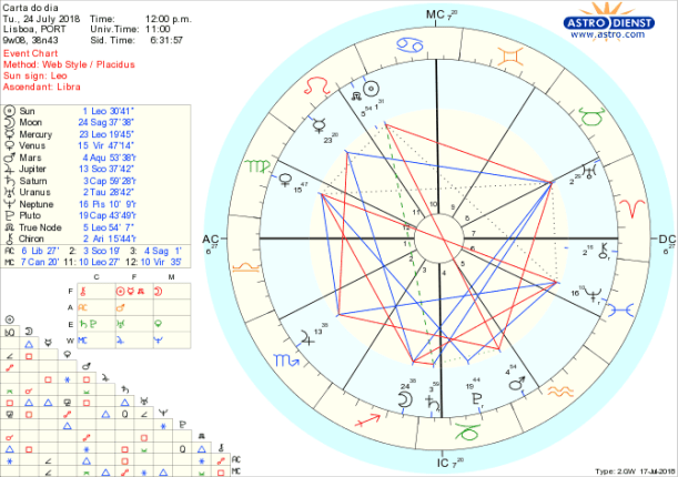 Aproxima-nos do eclipse da Lua mais longo no século XXI, visível em grandes partes da Austrália, Ásia, África, Europa e América do Sul. Será no dia 27 de Julho, em Portugal será total, com o nascer da Lua as 20.46, o ponto máximo de cobertura entre as 21.21 e as 22.13 e o final do eclipse já parcial às23.19.  A Lua e o seu Nódulo Sul, conjuntos a Marte,  vão desaparecer a 4 graus de Aquário, ocultados pelo Sol conjunto ao Nódulo Norte, a 4 graus do Leão, o todo quadrado a Urano em Touro. Em simultâneo Mercúrio entra retrógrado a 23 de Leão, recuando  este signo até 20 de Agosto.TABELAS HORÁRIAS PARA PORTUGAL NO FIM DO TEXTO
