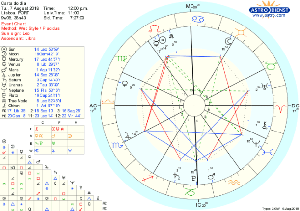 Confusões e oportunidades de esclarecimento são os motores de um dia que vai permitir continuar a estabilizar situações de mudança. A Lua em Gémeos, em quadratura a Neptuno em Peixes, dois signos duplos num aspecto de tensão levanta todo o tipo de questões sem que pareça aparecer um fio condutor mas o sextil da Lua a Sol e Mercúrio em Leão traz a oportunidade de falarmos do centro do coração e com isso sairmos de uma sopa de lógicas difusas. Podemos ser bem sucedidos ou não porque o Sol está em quadratura a Júpiter em Escorpião e tudo que for excesso de dramatismo, exageros, não passará. O que se deve e pode encontrar são novos equilíbrios nas relações e nas finanças que nos permitem estar de bem com os outros, com Vénus em Balança em trígono a Marte em Aquário. Mantem-se todo o mês o trígono de Saturno em Capricórnio a Urano em Touro regido pela Vénus agora em Balança e é de esperar soluções novas e equilibradas a partir de apostas realistas. Hoje e no resto da semana Venus está em quadratura a Saturno por isso mesmo com evoluções positivas não há lugar para festa.
