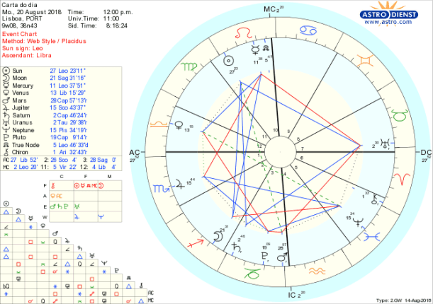 A semana começa gloriosa com a promessa de que o que houver de novo a concretizar está em vias de acontecer e podemos já hoje projectar essa transformação com resultados felizes. A Lua está em Sagitário, em trígono ao Sol em Leão enquanto persiste o trígono entre Júpiter em Escorpião e Neptuno em Peixes. Com estes aspectos podemos aspirar a ir mais longe, mostrar o que de facto valemos ou os sonhos que somos capazes de concretizar. Sonho e acção vão acabar por produzir concretização, já esta semana quando o Sol entrar em Virgem, em trígono a Urano em Touro e a Saturno em Capricórnio, um aspecto de pés na Terra e mudança auspíciosa a ter lugar sexta e sábado próximos. Também hoje Mercúrio – que tem estado retrógrado em Leão a forçar a revisão e melhor preparação de tudo o que pensávamos querer ser, entra directo o que dá novo ritmo e velocidade à lógica de actuação. Como Mercúrio vai continuar em Leão quando o Sol entrar em Virgem vamos poder dar o nosso cunho de criatividade ao detalhe de que tivermos de nos ocupar com os resultados satisfatórios que se esperar do trígono do Nódulo Norte em Leão a Quíron em Carneiro. Uma segunda feira para pôr os motores em marcha e estar pronto para arrancar!