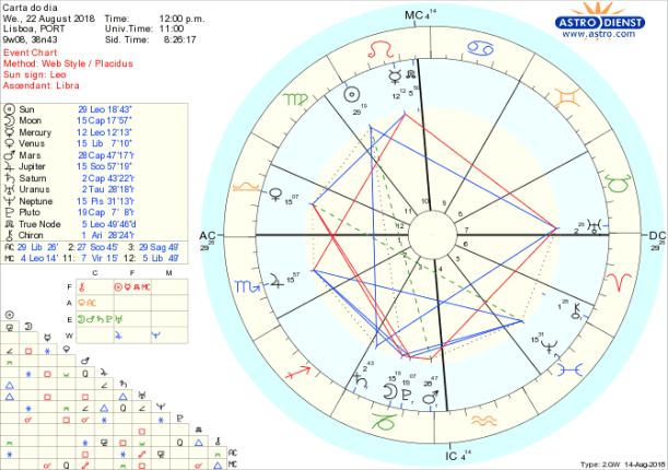 Na terça-feira a Lua activa um grande trígono de Terra que se está a formar entre o Sol -que avança para Virgem- , Saturno ao qual faz conjunção e Urano em Touro. Isto implica pragmatismo e investimento em novos valores a que nos dedicaremos com atenção ao detalhe durante um mês a partir da entrada do Sol em Virgem dia 23.