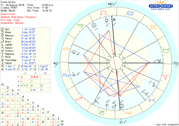 Não podemos estar presos ao que os outros inventam como soluções e temos pelo contrário de pensar de uma forma individual, lógica e clara qual a melhor maneira de tratar dos pormenores de organização em causa. A Lua está hoje em Aquário, faz quadratura a Urano em Touro, oposição ao Nódulo Norte num sinal claro da necessidade de ruptura com velhas ideias e dependências do colectivo enquanto o Sol em Virgem, Urano em Touro e Saturno em Capricórnio, num grande trígono de Terra simbolizam o olhar critico com que podemos identificar as questões e pôr em marcha a concretização de projectos inovadores que sirvam um propósito e sobre os quais nos devemos debruçar com atenção aos detalhes. Um sextil de Júpiter em Escorpião a Plutão em Capricórnio que está em sextil a Neptuno em Peixes cria as condições que permitem tornar os sonhos realidade. Pelo final do dia a oposição da Lua a Mercúrio em Leão e trígono a Vénus em Balança encoraja o diálogo sobre o que o que gostaríamos de inovar, criar, ser. Um pouco de contenção favorece os resultados.