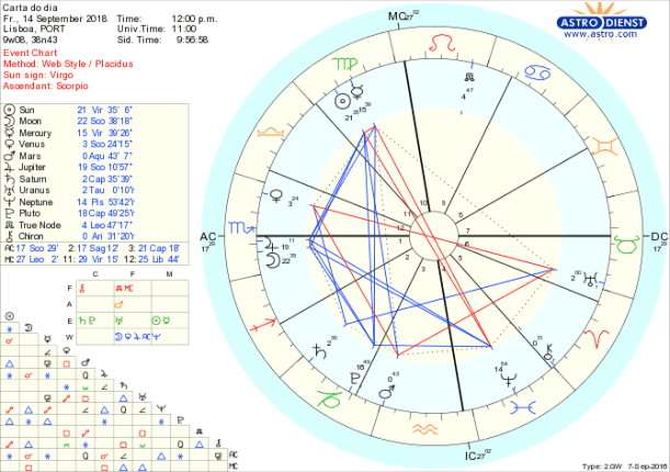 Sol e Mercúrio praticamente conjuntos em Virgem em trígono a Plutão são o olhar clinico, a lógica implacável, o sentido de detalhe e a capacidade de organização necessárias a que o entusiasmo da conjunção Lua/Júpiter produza resultados dignos de satisfação. Todo o resto do horóscopo do dia vai no mesmo sentido: há que ir à luta de coração ao alto e mover montanhas mesmo que seja pedra a pedra.