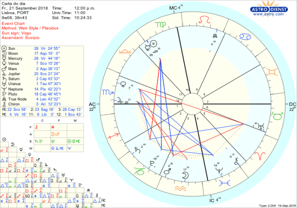 Focar o que é importante organizar – para dar seguimento às decisões recentemente tomadas ou para responder a novas circunstâncias – é a missão do dia, em vésperas do equinócio de Setembro – dia 23 as 02.54 GMT – e da Lua Cheia em Carneiro, no dia 25. A Lua está hoje em Aquário, em quadratura a Júpiter em Escorpião o que permite grandes projectos de remodelação da casa, das finanças ou da vida enquanto que Sol e Mercúrio conjuntos em Virgem ajudam a não nos perdermos em desenhos grandiosos e a sermos capazes de fazer planos minuciosos. Mas o que dá mesmo a energia direccionada para se atingir um novo grau de organização transformadora é o semi-sextil de Marte em Aquário a Saturno em Capricórnio que cria a oportunidade de alinhar vontade e concentração, capacidade de acção e de organização o que é o mesmo que pormos o foco no que tem de ser feito, de forma prática ainda hoje. Amanhã já a Lua entra em Peixes e é muito mais difícil de apontar as luzes porque nem sabemos para onde. Divagar será o mais apelativo no sábado por isso há que tirar rendimento dos aspectos de hoje. Atenção também às conversas que tragam à baila assuntos dolorosos do passado, feridas ou carências de afirmação. Mercúrio está hoje e nos próximos dias em oposição a Quíron em Carneiro e necessariamente devemos falar do que custa no que diz respeito à nossa própria capacidade de iniciativa. Tambem a 23 o Sol entra em Balança e fará oposição a Quíron por isso o que falarmos hoje na oposição de Mercúrio vai ter uma maré a subir de tom até ao equinócio enquanto procuramos novos equilíbrios nas relações seja qual for a sua natureza, inclusive a nível pessoal entre o nosso lado masculino e feminino.