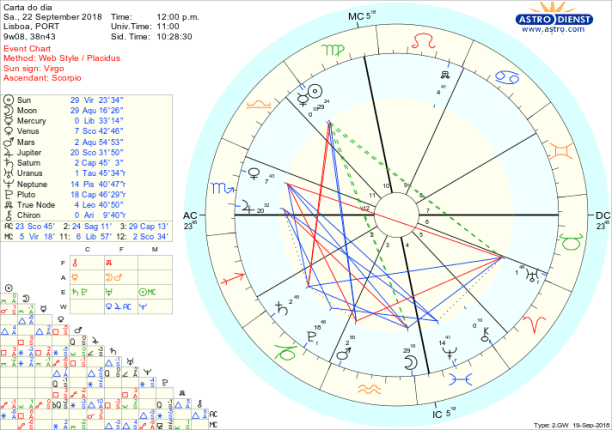 Assim, no sábado, com o Sol ainda em Virgem, há que atender aos detalhes que vão permitir que, a partir de domingo e até ao final de Outubro, nos possamos centrar no que tem de ser acordado entre as partes não podendo haver compromisso sem que todos sintam que a solução corresponde ao que sentem, que querem e está de acordo com o seu sentido de identidade. Este solstício testa a nossa integridade para que na Lua Cheia na terça feira, o sentir e o agir falem a uma só voz e isso tenha eco nos nossos parceiros amorosos, financeiros ou políticos.