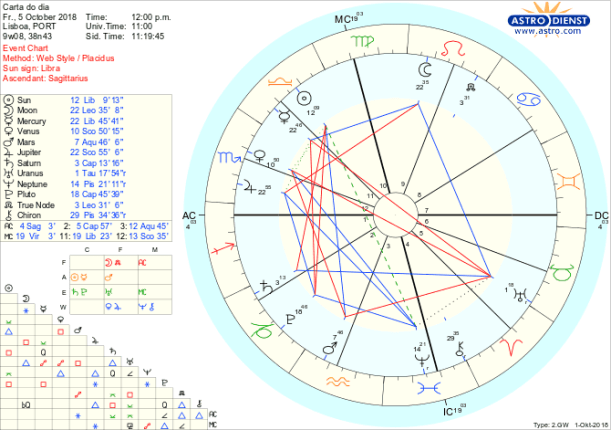 Hoje por um lado tornamo-nos menos exigentes mas, por outro, sabemos que temos que re-avaliar muito daquilo em que estamos empenhados. Vamos a caminho de uma tensão grave no equilíbrio das relações pessoais, financeiras, contratuais ou políticas, quando no próxima segunda feira o Sol em Balança fizer quadratura a Plutão em Capricórnio e desde já sentimos essa urgência de levar a cabo alterações profundas, repensando “investimentos” afectivos ou de qualquer outra natureza, com a entrada de Vénus em modo retrógrado em Escorpião. A única coisa que alivia toda a tensão do que está para acontecer é o trânsito hoje da Lua em Leão quadrada a Júpiter em Escorpião que nos faz baixar expectativas ou exigências simplesmente porque não estamos capazes de dramatizar tanto quanto poderia apetecer. Isto permite aproveitar ainda bem o dia e esperar pela presença da Lua em Virgem, desde a madrugada de amanhã, em trígono a Urano em Touro, e todo o fim de semana em trígono a Saturno e a Plutão, para começar a tomar medidas cuidadosas de revisão da matéria e conclusão de processos.
