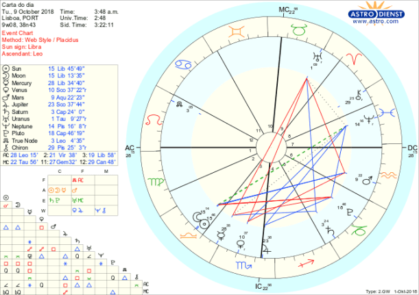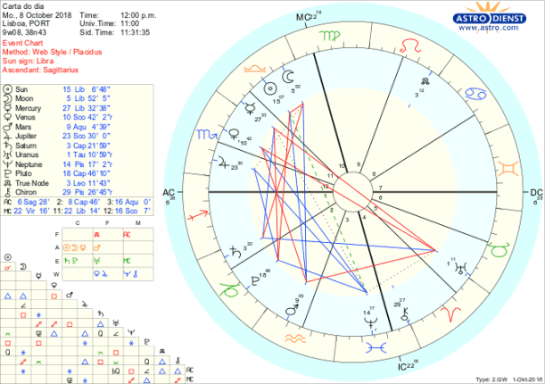 A semana começa com alguma frustração e a noção de que as relações têm de mudar em profundidade e muito rapidamente. Nesta segunda-feira, pela manhã, a Lua em Balança em quadratura a Saturno em Capricórnio leva-nos a desejar paz, justiça, relações equilibradas e a constatar que as expectativas não serão satisfeitas a menos que aceitemos restrições, limites e uma noção de ordem não desejadas. Daí a frustração vir a ser tanto maior quanto a nossa incapacidade de esfriar emoções. De seguida, a Lua faz trígono a Marte em Aquário o que nos leva a querer deixar marca no colectivo, mostrar aos amigos o que sentimos, agir para ilustrar que não desejamos conflito, mesmo que isso custe, e isto a caminho da madrugada de terça feira em que a Lua e o Sol se unem em Balança, em quadratura a Plutão em Capricórnio, com Mercúrio ainda em Balança mas já em oposição a Urano em Touro. O resultado é que estamos esta segunda feira no ultimo dia de um ciclo já que esta Lua Nova de Balança nos exige estar em relação de uma forma profundamente diferente do que tem sido. Casamentos, acordos, sociedades, tratados, o que partilhamos, a medida em que partilhamos, as estruturas de partilha, as dívidas, ónus e encargos emocionais, financeiros ou regime de poder das relações vão entrar numa nova fase e para não sermos surpreendidos, o melhor é sermos nós próprios a liderar os processos. Vénus, regente da Lua e Sol em Balança está em Escorpião, regido por Plutão ao qual Sol e Lua fazem quadratura, em quadratura também a Marte em Aquário. Esta posição da Vénus dá-nos a chave da Lua Nova: Apesar de só sentirmos que existimos como reflexo dos outros, não vale a pena empenhar-nos passional ou cegamente por aquilo que achamos que nos é devido. Melhor fazer bem os cálculos, com sentido prático e livres para mudar de paradigma.