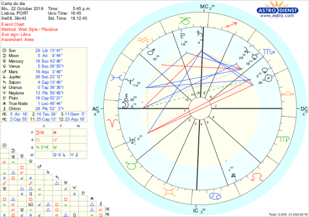 Hoje a amanhã, com a Lua em Carneiro e Marte em quadratura a Mercúrio em Escorpião, o impulso para tomar iniciativas polémicas que provoquem reações verbais e não só com impacto colectivo, é enorme. A nível individual torna-se necessário um esforço grande de controlo dos ímpetos de acção e das palavras que se escolhe para justificar posições de poder. A nível global, na política, dificilmente escaparemos a tomadas de posição que a todos ameaçam. A Lua hoje está também em quadratura a Saturno em Capricórnio, reforço dos limites e responsabilidades com que as iniciativas menos bem pensadas terão de se confrontar e que resfriam os ânimos. Amanhã, terça-feira pela tarde GMT, também o Sol sai do signo pacificador da Balança para entrar em Escorpião onde estão já Vénus, Mercúrio e Júpiter, numa sobrecarga de energias intensas que pedem o controlo total ou eliminação de certas circunstâncias existentes, numa necessidade de regeneração a bem ou a mal, no quadro do que partilhamos com os outros, sexo, heranças, empréstimos, o poder, questões viscerais de vida e de morte. É para uma Lua Cheia em Touro, conjunta a Urano e oposta a esse Sol em Escorpião, -que vai revelar o que temos ou não a que nos agarrar, – que caminhamos na próxima quarta feira. Hoje e terça não podemos desperdiçar energias com iniciativas que não sejam pensadas para chegarmos a um novo patamar de consciência do que deve ser mantido e do supérfluo a largar.