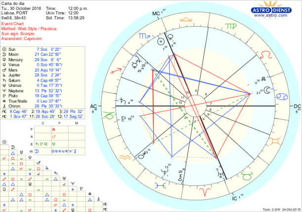 Durante todo o dia a Lua permanece em Caranguejo e as nossas emoções permanecem também orientadas para assuntos íntimos, domésticos, familiares ou então de carácter nacional já que este signo representa também as nossas raízes. Apesar do desejo que tudo fique na mesma ou que não seja ameaçada a estabilidade emocional por muito precária que seja, o facto é que somos chamados a encontrar uma nova base de sustentação e a regenerar ideias, projeções e desejos, com Mercúrio, Júpiter, Sol e Vénus em Escorpião a porem todo o foco, energia e propósito nos processos de morte e renascimento, eliminação e restruturação da nossa organização e ligações na vida. De facto, estamos a preparar-nos hoje para, nos próximos dias, quarta e quinta, quando a Lua entrar em Leão em conjunção ao Nódulo Norte e em quadratura a Vénus e a Urano assumirmos novos valores, novas vestes, outra atitude no palco do quotidiano, o orgulho de sermos quem somos mesmo que isso implique uma revisão dos equílibrios de partilhas amorosas, materiais ou de controlos de poder. Vamos então poder mostrar o que valeu a pena preservar depois de ontem e hoje termos estado a depurar emoções, amarras, hábitos ou situações que precisavam de ser arejadas. O trabalho de hoje com o trígono da Lua a Júpiter e a Mercúrio, depois de se opor a Plutão é o de ir o mais longe possível nessa “limpeza” e recriação da nossa solidez emocional, por nós, pela família pelo que for o nosso “ninho”. Mas com Marte em Aquário quadrado a Júpiter e Mercúrio e quincúncio à Lua, é fundamental pensar antes de agir ou mesmo meditar antes de pensar..