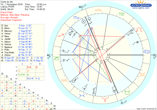 O difícil hoje é não exagerar mas o bom é que podemos exprimir o que pensamos ao mesmo tempo que re-avaliamos as relações em que estamos envolvidos dando-lhes um novo sentido ou valor. A Lua está em Leão, oposta a Marte em Aquário o que se traduz num conflito entre o que aspiramos ser e a forma como nos defendemos e como faz quadratura a Júpiter em Escorpião e a Mercúrio em Sagitário é fácil ir-se longe demais no dramatismo dos desejos ou da expressão do sentido de identidade. Estamos a regenerar, purificar a nossa posição no quadro do que partilhamos física, emocional ou financeiramente, com o Sol em Escorpião e com Vénus retrógrada de regresso a Balança é o re-equilibrio das relações com base em novos valores que procuramos, tentando não deixar de ser quem somos sem deixar de construir novas harmonias, resolvendo assim a quadratura de Vénus ao Nódulo Norte e oposição a Urano. É o trígono de Mercúrio em Sagitário ao Nódulo Norte em Leão que garante que é possível com fluidez seguirmos o nosso próprio caminho, expressarmos a nossa própria lógica, encontrar as ideias que melhor representam quem queremos ser. Só é preciso não nos exaltarmos e o dia será produtivo e pode mesmo trazer a cura para dores antigas, graças ao trígono de Júpiter a Quíron em Peixes.