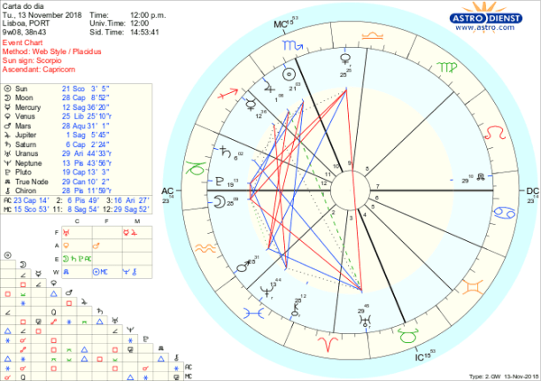 Mais um dia de tensão, desta vez entre a ordem e estabilidade desejadas face à força das circunstâncias que irrompem e abalam o equilíbrio que defendemos nas relações,  mesmo admitindo que haja alterações. A Lua está, até à tarde, em Capricórnio em quadratura a Vénus em Balança e a Urano em Carneiro, opondo-se também ao Nódulo Norte em Leão, enquanto Marte em Aquário faz trígono a Vénus e sextil a Urano. É a conjunção da Lua ao Nódulo Sul e quadratura de Vénus e Urano ao Nódulo Norte que dão o simbolismo mais significativo das dificuldades do dia: Como ser capaz de abandonar a ambição de controlar tudo e todos remando contra as marés tanto da harmonia como da ruptura para procurar apenas no íntimo a estabilidade desejada?  O Sol em Escorpião em semi-quadratura a Saturno em Capricórnio reforça essa dificuldade no processo de transformação. No fundo o único controlo que podemos ter é sobre nós próprios e só isso nos vai trazer a possibilidade de estar no mundo com ou outra dinâmica para qual temos o apoio de Júpiter em Sagitário em sextil à Lua quando esta entrar, pela tarde, em Aquário. Hoje vai ser preciso sangue frio, auto-critica e introspecção para chegarmos aos resultados desejados por meios que antes não tínhamos considerado. E quanto menos dissermos melhor já que uma quadratura de Mercúrio em Sagitário a Neptuno em Peixes ilude até a nossa própria lógica.