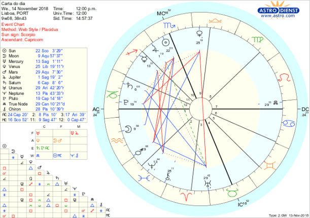É a razão ou a lógica de futuro, a inovação, a ruptura com velhos padrões que nos guia hoje através das tensões de mudança, num tempo de olhar não para dentro mas para fora, para longe com atenção redobrada para não enganar ninguém nem a nós próprios com ideias ou expectativas fantasiosas. A Lua está em Aquário, regida por Urano retrogrado em Carneiro e Saturno em Capricórnio, sinais de que temos de olhar para o futuro revendo as opções antigas e as acções possíveis e tentando criar novas estruturas, mesmo se houver conflito e sempre num esforço de chegar a novos equilíbrios nas relações porque a Lua faz na sexta feira conjunção a Marte e trígono a Vénus, depois de uma quadratura ao Sol em Escorpião e é para essa tensão que caminhamos, em busca de uma saída regeneradora possibilitada pelo trígono de Júpiter em Sagitário a Quíron em Peixes. Mercúrio também em Sagitário mas em quadratura a Neptuno em Peixes é o aspecto que ilude e confunde e exige por isso um máximo de seriedade, já e a pensar nas implicações futuras. Não podemos esquecer que estamos numa encruzilhada marcada pela quadratura de Urano e Vénus aos Nódulos. Como renovar, casa, negócios, relações, tratados, sem entrar em conflito mas garantindo a defesa dos nossos próprios interesses? Com a Lua, regente do Nódulo Norte em Caranguejo, hoje em trânsito em Aquário, navegação costeira destas complexas questões orienta-nos para tentarmos encontrar ecos e apoios para irmos mais longe, apesar dos compromissos parecerem impossíveis.
