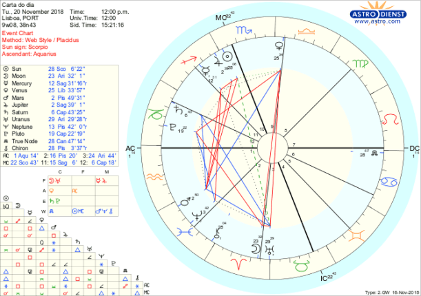 A caminho da Lua Cheia em Gémeos, no próximo dia 23, em que novas oportunidades de expansão se abrem – porque outras se fecham- estamos tal como ontem, hoje também a aliviar carga, rever iniciativas e deixar-nos surpreender por outras perspectivas de forma a aprofundar o que tem de mudar por força do Sol em Escorpião e da Lua em Carneiro, conjunta agora a Urano retrógrado. Marte que rege o Escorpião e o Carneiro está em trânsito em Peixes em quadratura a Júpiter em Sagitário a dizer-nos que é tempo de avançar, progredir mas para isso é importante fazer ajustamentos nos processos iniciados há cerca de três anos quando do último aspecto entre os dois planetas. A energia que desenvolvem é intensa mas exige controlo para não se disparar em todas as direcções. Há também o risco de atrasos e confusões com Mercúrio retrógrado em trígono a Neptuno em Peixes mas faz parte do processo podermos revistar sonhos, fantasias ou a lógica a seguir para futuro. Hoje, a Lua ao fazer conjunção a Urano em Carneiro e oposição a Vénus em Balança chama a nossa atenção para as dificuldades existentes nas relações e leva-nos a romper com situações cujo equilibrio ou justiça é posto em causa. Este aspecto faz também quadratura ao Nódulo Norte em Caranguejo o que revela a tensão entre as rupturas necessárias e a necessidade de mantermos a nossa segurança emocional, doméstica, nacional. Assim, as circunstâncias do dia levam-nos a tomar consciência do que há a fazer, pegar, largar, mudar, procurando dominar impulsos mas sem deixar de optar por soluções que mesmo que radicais permitam sentirmos que estamos a defender os nossos próprios interesses de preferência redefinindo ligações ou acordos.