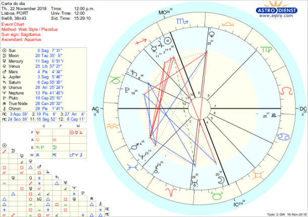 A entrada do Sol hoje em Sagitário vem mudar o foco das atenções do controlo que temos de bens e relações para o projecto de futuro que queremos desenvolver, para a verdade ou filosofia de vida que nos pode guiar, para abrir horizontes e viajar com o corpo, mente e o espírito. Com este objectivo vem também a dificuldade de definir esse trajecto, essa verdade, afirmar as ideias que nos movem: afinal quais são ou onde queremos chegar? A sensação de falta de consistência e tensão entre o projecto e a acção é acentuada pela quadratura do Sol, hoje e nos próximos dias, a Marte em Peixes e também pela retrogradação de Mercúrio em Sagitário, tudo empolado pela presença de Júpiter em conjunção a Sol e Mercúrio e naturalmente quadrado a Marte. Este está em semi-quadratura a Plutão em Capricórnio o que contribui também para bloquear grandes transformações. Estamos assim cheios de Fogo mas a levar com baldes de Água e de Terra que nos impedem de progredir como desejado. Os avanços são feitos aos poucos conforme conseguirmos estabilizar valores, redefinir a base das relações e, não indo atrás das emoções imediatas, ter uma perspectiva prática a longo prazo dos processos em curso. Esta abordagem é hoje favorecida pelo trígono da Lua em Touro a Plutão em Capricórnio mas rapidamente vamos ter de encarar a tensão da Lua Cheia em Gémeos, na madrugada de amanhã, dia 23, pelas 05.40 GMT. Veja mais sobre a Lua Cheia da próxima madrugada no texto de segunda feira