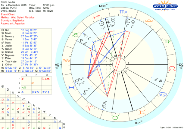É difícil entender para que lado caem as coisas hoje já que os sentimentos são contraditórios ou mesmo nebulosos. Temos ideias para o futuro mas as acções possíveis estão demasiado carregadas de fantasia, ideais ou mesmo de erros e a tensão entre o que se quer e o que se consegue fazer é grande com o Sol em Sagitário em quadratura tanto a Marte como a Neptuno em Peixes. Em simultâneo, a Lua em Escorpião, regida por Marte, faz trígonos a esses dois planetas o que nos dá a impressão de que o que fazemos é o certo para dominar as situações e ser capaz de controlar bens ou situações de poderes partilhados. Vénus está também em Escorpião o que intensifica os desejos a todos os níveis e como Mercúrio retrógrado voltou a este signo apesar do desejo de domínio das situações estamos a ser obrigados a rever esse mesmo desejo porque percebemos, pela lógica que para seguir em frente existem assuntos e divisões de poder que têm de ser re-equacionadas. Como Mercúrio está em trígono ao Nódulo Norte em Caranguejo, todo esse repensar deve ser orientado para o que nos dá segurança emocional, familiar, doméstica, nacional. Não são tempos de abertura, são tempos de procura de respostas internas antes de podermos projectarmo-nos para o exterior. Temos até sexta-feira para eliminar um máximo de assuntos e entraves pendentes, sempre em função do que é mesmo bom para nós próprios e para os nossos.