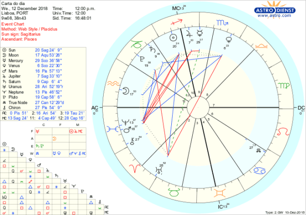 Abrem-se hoje oportunidades para podermos pensar em ir mais longe, organizar bens e finanças de outra maneira, debatidas em profundidade todas as questões pendentes e encontrados apoios para os nossos propósitos. Mas atenção, o facto de se abrirem oportunidades não quer dizer que estejamos já a chegar a resultados e toda a atenção é pouca para prosseguir passo a passo em direcção ao que nos der segurança emocional, familiar, nacional. A Lua em Aquário em sextil ao Sol em Sagitário facilita encontrarmos eco para as nossas ideias ou projectos inovadores. Estes serão necessariamente resultado da revisão impulsos anteriores que tenham posto em causa os tais objectivos de segurança porque Urano o regente do Aquário está retrogrado em Carneiro, em quadratura ao Nódulo Norte em Caranguejo- regido pela Lua!! Se o que é novo põe em causa as nossas necessidades primárias de segurança emocional ou outra é a grande questão com que nos debatemos a nível pessoal e colectivo e por isso enquanto Mercúrio tem estado em Escorpião o debate tem sido intenso ou a avaliação do que está em causa, profunda. Mercúrio entra na noite de hoje em Sagitário e vamos poder pensar de forma mais livre, mais virada para o futuro, para onde queremos chegar. Mas como só chega a Capricórnio, – onde poderemos debater a ordem que agora estamos a projectar, em Janeiro, quando também Vénus sair de Escorpião e entrar em Sagitário, isto em cima do primeiro eclipse do ano, dia 6 de Janeiro, no meio ponto de Saturno e Plutão em Capricórnio, – o que temos agora é apenas o preâmbulo do que se vai desenrolar no início de 2019 mas que terá várias encruzilhadas até lá. Por hoje e nos próximos dias, quaisquer que sejam os imprevistos, tremores ou necessidade de re-orientação podemos agarrar-nos ao sextil de Vénus em Escorpião a Saturno em Capricórnio que nos ajuda a encontrar um sentido para o que queremos transformar, melhorar, partilhar de forma mais profunda. Vénus vai também fazer trígonos a Marte e a Neptuno em Peixes e será com maior “fé” que daremos os passos, lentos mas seguros para a tal segurança desejada, quando também nesse eclipse de Janeiro Vénus nos últimos graus do Escorpião vier a fazer trígono ao Nódulo Norte em Caranguejo. É de ir sem pressa mas com sentido de direcção.