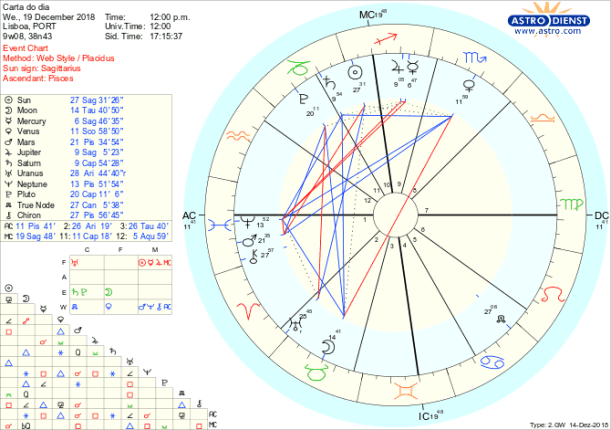 Hoje, a quem temos de tratar bem é a nós próprios. Há que começar por encarar as fragilidades de longa data, a moínha do coração que se agrava quando tocada, as inseguranças e carências nas ideias ou nos sucessos. O Sol em Sagitário em quadratura a Quíron em Peixes, ambos regidos por Júpiter agora conjunto a Mercúrio, quadrado a Neptuno sente todas as dores antigas de não termos ido tão longe quando tinhamos projectado em qualquer área de vida mas em vez de nos fustigarmos podemos aproveitar a energia da Lua em Touro em trígono a Plutão em Capricórnio para apostar noutros valores e noutra organização de vida que nos faça sentir mais em controlo, mais valorizados. A ajudar termos outra perspectiva sobre os males do passado que ainda se fazem sentir, está o trígono ao Sol e semi.sextil a Quíron de Urano retrógrado em Carneiro. Repensar impulsos e abandonar velhas respostas instintivas ou dependências também faz parte do programa de hoje em que o perdão é pessoal e a compaixão vem com um trígono de Vénus a Neptuno..