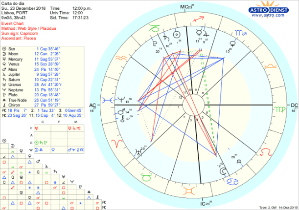 Depois do Solstício de sexta-feira temos no sábado o ingresso da Lua em Caranguejo, oposta, Cheia, ao Sol em Capricórnio e no domingo, ainda em Caranguejo, oposta a Saturno e a caminho de uma oposição a Plutão, também eles em Capricórnio. Isto ilustra a profunda discordância entre a segurança que ambicionamos, pessoal, familiar, emocional, nacional e o que nos dá ou permitem as estruturas em que estamos inseridos, domestica, política e socialmente. Por um lado desejamos casa, ninho, rotinas, tradições, por outro há uma ordem fria que nos condiciona e deprime. Pode ser a família que desejávamos e a família que temos, pode ser o país a que aspiramos e o governo que temos… Apesar disto não podemos perder a esperança de que vamos conseguir chegar a um lugar melhor, a dificuldade está em conciliar expectativas e razão. Mercúrio e Júpiter estão conjuntos em Sagitário em quadratura a Neptuno em Peixes e estes aspectos não deixarão menos fazer sentir a tensão entre as grandes ideias e como projectamos concretizá-las porque dificilmente encontramos seco ou empatia desejados. De facto a chave continua a ser ir ao fundo do que queremos mudar e organizarmo-nos pragmaticamente nesse sentido. Tudo o resto são distrações, tanto a carência de segurança desta Lua Cheia como as falsas expectativas dos aspectos a Neptuno de Júpiter e Mercúrio. A quadratura de Urano retrógrado em Carneiro ao Nódulo Norte em Caranguejo persiste como pano de fundo a orientar-nos no sentido de agirmos de maneira diferente, libertando-nos de velhas compulsões para ganharmos a tal segurança a que a Lua Cheia deste fim-de-semana nos faz aspirar. A segurança tem de estar em nós próprios…