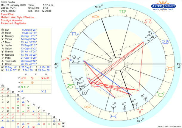 Já a 21 de Janeiro, o eclipse parcial da Lua em Leão, oposta ao Sol em Aquário, depois de um quadrado a Urano e com Marte em trígono a Venus e Jupiter em Sagitário mostra-nos que largando amarras e egocentrismos estamos no bom caminho para fazer os projectos avançar mas tudo o que for apenas de interesse pessoal e não contemple o interesse colectivo está condenado a frustração com Marte e Saturno em quadratura. Carneiros do segundo decanta e Leões e Aquários do primeiro decanato têm que estar prontos a rever posições e emoções!