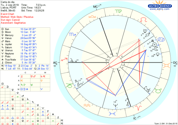 Os resultados dessa re-orientação de vida e padrões de segurança que desenvolvemos desde Janeiro começam a tornar-se evidentes nos eclipses total do Sol em 2 de Julho a 10 graus de Caranguejo e parcial da Lua dia 16 de Julho a 24 graus de Capricórnio. Saturno e Plutão opostos ao Eclipse do Sol com Saturno conjunto ao Nódulo Sul mostram a dificuldade desses passos numa nova direcção mas tomar-la é inevitável. Os últimos seis meses do ano são a preparação final para que em Janeiro de 2020, mesmo com algum custo possamos singrar individual e colectivamente em novos paradigmas.