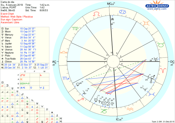 Janeiro: A Lua Nova e eclipse parcial do Sol no dia 6 de Janeiro, a 15 graus de Capricórnio, entre Saturno e Plutão dá-nos logo no arranque do ano muita informação sobre o que está para vir. Capricórnios, Caranguejos, Carneiros e Balanças do segundo decanato são quem mais tensão pode sentir mas há que aproveitar para planear a médio e longo prazo. As discussões são prováveis com Mercúrio em Capricórnio em quadratura a Marte em Carneiro.