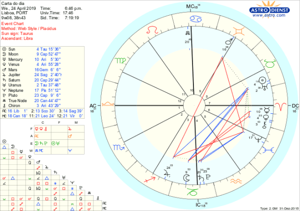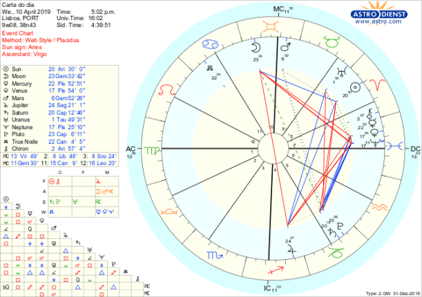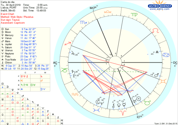 Para todos sob os Céus, a expansão e a organização entram em modo de revisão e o que formos fazendo até que esses três planetas voltem a estar directos respectivamente a 12 de Agosto, 4 de Outubro e 19 de Setembro são apenas correcções de rumo e não os motores a fundo unidirecionados. Isso só acontece no Outono para se chegar a Janeiro de 2020 com os propósitos afinados e a capacidade de fazer revoluções reais. Neste período serão os Sagitários, os Gémeos, os Capricórnios e os Caranguejos quem mais trabalhos de casa terão de fazer.. É de notar que no dia em que saturno entra retrógrado, 30 de Abril, está exatamente em oposição ao Nódulo Norte, a puxar-nos para o que era passado e a que ainda estamos agarrados, mesmo depois de em Março e princípio de Abril Plutão ter também feito conjunção ao Nódulo Sul da Lua. São sinais muito fortes de que a segurança emocional, familiar, doméstica ou nacional a que aspiramos exige toda uma outra organização de coisas que temos de rever ate ao Outono para então podermos começar a criar novas bases, novas regras adequadas ao que se pretende de futuro no inícionde 2020 quando Saturno e Plutão se encontrarem a 22 graus de Capricórnio.