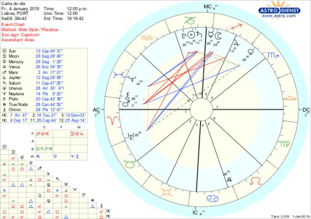 Pela hora de almoço GMT torna-se fácil falar do futuro, das viagens do corpo e do espirito, do que se sabe e deseja saber e como contamos com isso inovar, abrir novos horizontes graças à conjunção da Lua a Mercúrio em Sagitário em trígono a Urano em Carneiro. Há que ter atenção a feridas de incompreensão e dar o desconto a respostas menos encorajadoras com uma quadratura de Quíron em Peixes à Lua e a Mercúrio. O facto é que a tendência é para empolar sonhos, fantasias, ambição de grandeza ou expansão de objectivos mas a quadratura de Júpiter em Sagitário a Neptuno em Peixes é um teste às nossas expectativas e tudo o que não tiver bases sólidas não tem futuro. Porque Sol e Saturno estão conjuntos em Capricórnio e avançamos para um eclipse total do Sol em Capricórnio no dia 6 na Lua Nova de Capricórnio -em que Mercúrio também já estará neste signo,- estes são muitos sinais de que o que desejamos hoje tem de ser formatado a partir deste eclipse. O novo tem de dar lugar ao velho, há padrões de comportamento e sistemas de organização e posições de poder que devem ser substituídos por novas estruturas de vida e vamos por isso até ao eclipse aprofundar com paixão o que deve ser mudado para nos sentirmos melhor na nossa pele e nas nossas relações com Vénus em Escorpião em trígono a Quíron em Peixes. O quincúncio de Vénus a Urano estacionário traz surpresas a que teremos de nos ajustar e a flexibilidade e abertura a iniciativas até agora não contempladas pode valer a pena. Mas o trígono de Vénus ao NóduloNorte em Caranguejo é o garante de que estamos a progredir no sentido de uma maior segurança emocional em tudo o que nos rodeia.