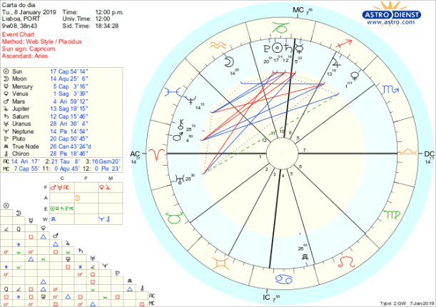 Hoje é um dia para levantar questões, não acreditarmos em tudo que nos dizem e não entrar em discussões sem que a causa seja fundamentada e já tenhamos um plano testado, à prova de crítica. O Sol em Capricórnio ladeado por Saturno e Plutão traz gravidade a tudo que nos preocupe, mais ainda se procuramos, com a Lua em Aquário, o apoio externo, a solidariedade para inovar e desenvolver as vias de acção e estruturas de base que nos propusemos levar a cabo em 2019. Vénus recém entrada em Sagitário onde também se encontra Júpiter traz a paixão para essa abertura de espírito necessária para dar Fogo à construção de alicerces e seu trígono a Marte em Carneiro facilita as iniciativas. Mas tudo tem um lado sombra que aqui se manifesta como a ideia de que nada é suficientemente bom e que a relva do vizinho é sempre mais verde o que tira a concentração necessária num projecto unidireccionado. E talvez por causa desse risco Mercúrio em Capricórnio em quadratura a Marte vai trazer à tona todas as críticas e discussões sobre o que for leve e apenas aspirational, mais ainda porque a quadratura de Júpiter a Neptuno como pano de fundo também não dá garantes de solidez, apenas de sonhos que para realizar precisam de bastante esforço. Urano em Carneiro entra directo, regido pelo Marte quadrado a Mercúrio e isto exige que questionemos todas as iniciativas principalmente pela quadratura de Urano ao Nódulo Norte em Caranguejo: o que estamos impulsionar é no fundo bom ou não para a tão desejada segurança emocional, familiar, nacional? Este é o objectivo para o qual temos de criar novas bases sólidas.