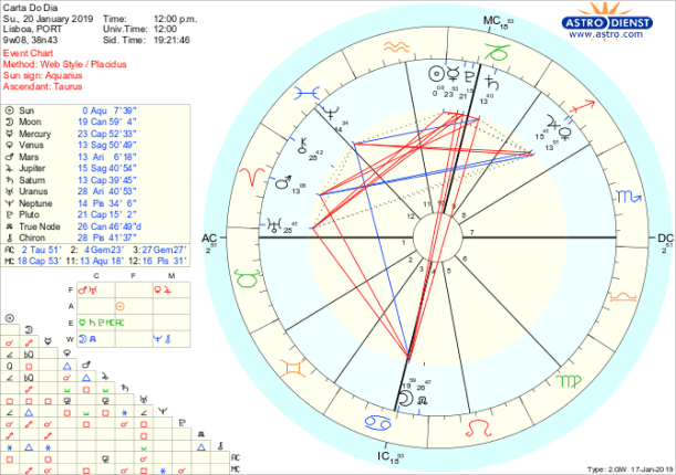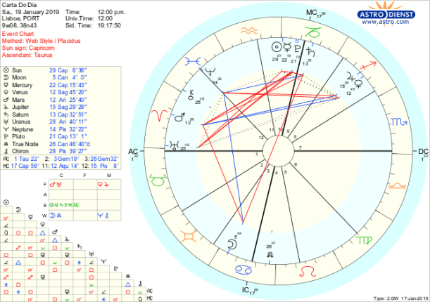 A única maneira de sentir menos frustração com os trânsitos do fim–de-semana é encontrar um novo equilíbrio emocional pessoal a que nos possamos agarrar, mais provável no domingo quando a Lua se encontrar com o Nódulo Norte. Firmes do nosso propósito há que investir numa chave pessoal para abrir as portas de fora, bloqueadas ou potencialmente perigosas. Energia não falta com Vénus e Júpiter em trígono a Marte, mas também há ilusões que é preciso descodificar derivadas da quadratura de Jupiter e semi-quadratura do Sol a Neptuno e uma revisão das atitudes que tomamos que podem por em risco a segurança emocional que tanto desejamos, pela quadratura de Urano em Carneiro ao Nódulo Norte em Caranguejo.Todo o exercício para encontrar novas bases de segurança pessoal ou nacional serve para encararmos na segunda-feira 21 o eclipse da Lua Cheia em Leão: quem somos e como nos colocamos no mundo passa a ter novo registo depois deste eclipse.