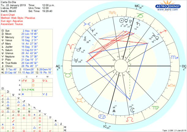 Que vontade de fazer coisas, mostrar do que somos capazes, investir no futuro! O impulso de agir, em grande, está hoje bem presente mas os limites à actuação também são fortes. Por um lado a Lua em Leão, Vénus e Júpiter em Sagitário e Marte em Carneiro formam um belo trígono de Fogo que apela à acção mas em simultâneo Saturno em Capricórnio está em quadratura a Marte e só isso é suficiente para pôr travões a tudo o que não for suficientemente pragmático, bem organizado e que represente uma programação estruturada do que idealizamos dado o sextil entre Saturno e Neptuno. Em vez de irritação, frustração ou insistência no impossível, a chave está na maturidade das decisões e no respirar fundo antes de avançar cegamente para o abismo aberto pela quadratura crescente de Marte a Plutão. Marte quer tudo já, agora, imediatamente e o trígono de Fogo atiça ainda mais as chamas dessa vontade mas daqui até à Lua Nova de 4 de Fevereiro há que tentar evitar conflitos de poder e procurar lutar por causas maiores e não pela satisfação pura do desejo já que isso está condenado por forças maiores. Amanhã dia 23 já a Lua vai estar em Virgem, baixa o nível de dramatismo e serão os pormenores que nos ocupam.