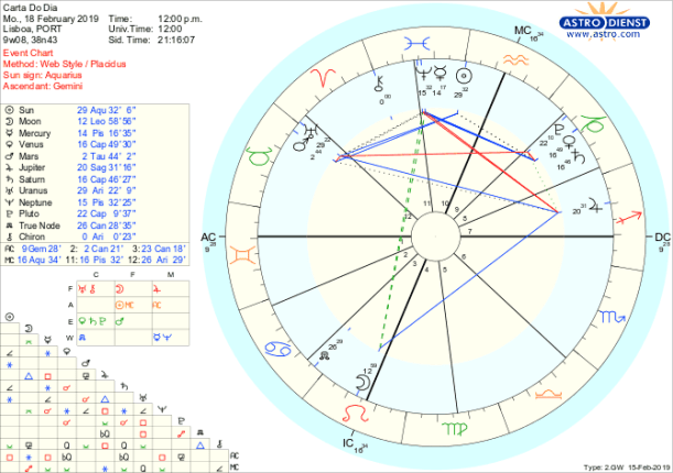Amanhã temos o Sol a entrar em Peixes e a Lua a opor-se-lhe, Cheia em Virgem. Veremos se fomos capazes de “curar” a dor de pertença, – o que trabalhámos com o  trânsito  de Quíron em Peixes,-  sendo agora eficientes na concretização dos sonhos, atentos na dádiva, generosos também no detalhe, começando assim a trabalhar as lições de Quíron recém entrado em Carneiro. Até lá,  hoje a Lua em Leão ainda nos puxa pelo ego, principalmente com um trígono pela tarde a Júpiter em Sagitário. Bem usado, podemos usar esse entusiasmo para nos dedicarmos a fazer tudo bem feito, com todos os cuidados e ser isso que nos dê orgulho.