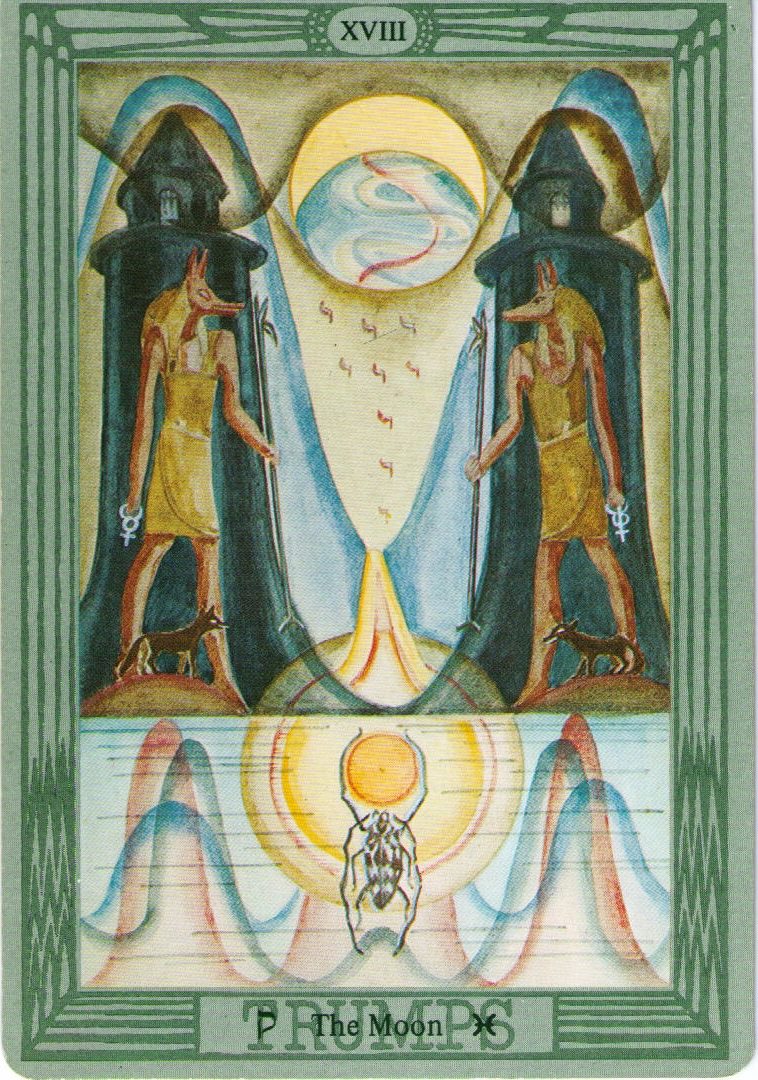 A Lua do Tarot corresponde ao signo onde transita agora o Sol, Peixes, da devoção, da transcendência (enquanto que a Lua astrológica está referenciada à Sacerdotisa, que nos acompanhou na semana que passou). A letra hebraica que corresponde a esta Lua é KOPH, ou KUF, um ciclo de tempo. O seu número 18, na numerologia cabalística, representa imaginação, instabilidade e algo oculto. O seu título esotérico é “O Regulador do Fluxo e do Refluxo” ou “A criança dos Filhos do Poder”.