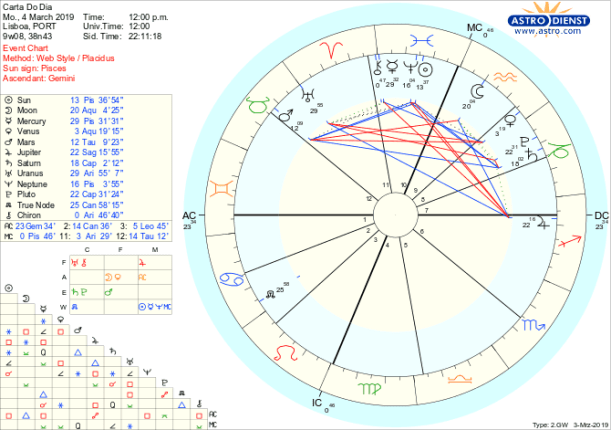 A entrada de Urano em Touro pode ser um choque material para alguns mas é importante ter confiança no trígono de Marte também em Touro a Saturno e a Plutão em Capricórnio que se vai fazer sentir desde já e até à Lua Cheia em Balança no dia 21. Ou seja, não vamos ficar paralisados com a retrogradação de Mercúrio, nem a navegar nas nuvens com tantos planetas em Peixes, nem despojados de valores com Urano em Touro. Graças a esses aspectos de Marte temos a capacidade de fazer coisas concretas, bem feitas, a pensar no longoprazo, que nos vão dar e nova estabilidade e um sentido para acção que passa pela influência de Vénus em Aquário- em recepção mutua com Urano- que nos diz que não estamos a agir só para o nosso próprio interesse mas sim para o bem comum. Com este aspecto, tudo o que fizemos que vá mais longe que o nosso umbigo tem mais hipóteses de nos trazer satisfação pessoal do que se apostamos apenas no foco individual. No entanto, não nos podemos esquecer que o Nódulo Norte está em Caranguejo, regido pela Lua e por isso em nome do bem comum temos também de criar um novo espaço de segurança emocional pessoal, doméstica, familiar, nacional. Tem de haver um “ninho” pessoal ou colectivo e não nos podemos alhear das necessidade do outro ou dos outros. Quem são esses outros é o que a Lua hoje nos faz reflectir com o seu trânsito ainda em Aquário, com Urano seu regente ainda em Carneiro. Um sextil da Lua a Júpiter em Sagitário dá-nos hoje a oportunidade de projectarmos todas as inovações que há a fazer na Lua Nova que aí vem, com uma maior consciência da Verdade que nos move.
