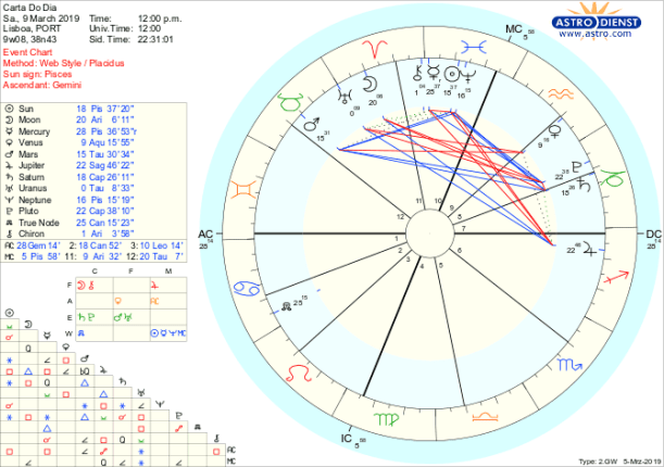 Não esquecer Mercúrio retrogrado em Peixes, até ao fim do mês, a fazer conjunções ao Sol e a Neptuno e sextis a Saturno, Plutão e Marte. Isto simboliza a necessidade e possibilidade de revermos fantasias e lhes darmos forma, com sentido critico, sentido prático e sentido de futuro. Tratar dos assuntos menos claros na nossa mente ou pendentes na realidade pode ter agora belíssimos resultados. Mergulho nas sombras e mãos à obra!