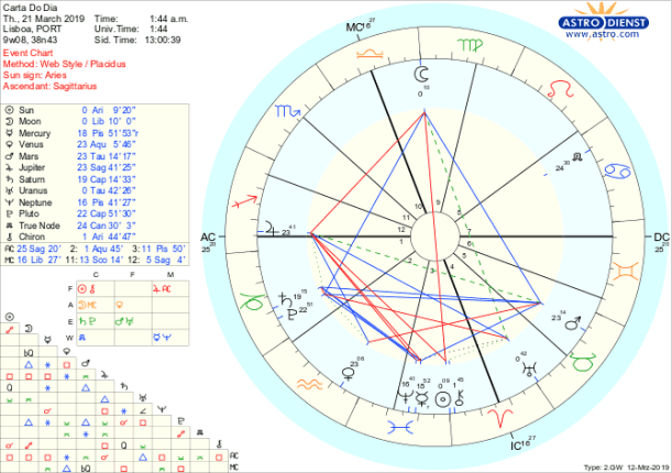 Outro contributo para as dificuldades de entendimento vem da presença de Quíron em Carneiro conjunto ao Sol e oposto à Lua em Balança, uma ferida antiga que se volta a abrir quando agimos ou porque não agimos, numa pressão profunda para conseguimos simultaneamente tomar posição e não por em causa as relações. Um quincúncio da Lua a Urano diz-nos que isso só é possível se inovarmos depois de largar amarras mas Mercúrio retrógrado em Peixes conjunto a Neptuno não nos deixa sair facilmente de velhas embrulhadas que vamos ter de desfazer até dia 29 quando entra directo. O Nódulo Norte em Caranguejo, regido pela Lua e oposto até ao final de Abril a Plutão e a Saturno em Capricórnio dá-nos o pano de fundo em que todas estas tensões decorrem- para conquistarmos a nossa segurança emocional pessoal ou nacional temos de deixar as estruturas que integramos e fazer-nos à vida- é disto também que trata o Brexit..