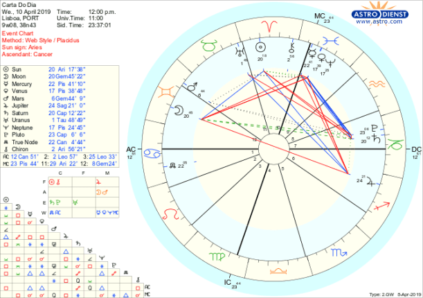 É com independência mas também dúvidas que clamamos hoje a nossa vontade. Esta, no entanto, é perturbada pela contabilidade entre o que damos e o que recebemos e podemos acabar a questionar seriamente objectivos e aspirações, num gigantesco remoinho de ideias e possibilidades. É por isso difícil tomar hoje decisões e devemos aproveitar o dia para o debate de tudo o que estiver em causa. A Lua está em Gémeos, quadrada a Neptuno, Venus e Mercúrio em Peixes, oposta a Jupiter em Sagitário e quincúncio a Saturno e Plutão. Sentimos na pele a tensão e resistência que se levantam com a avaliação das hipóteses, possivelmente pouco claras pelos aspectos aos planetas em Peixes enquanto que o Sol em Carneiro, regido por Marte em Gémeos está em quadratura a Saturno e avança para uma quadratura a Plutão- um cenário de muito pouca flexibilidade e alta tensão para as negociações do Brexit ou quaisquer outras… Só na madrugada de dia 11, pelas duas da manhã GMT, quando a Lua entrar em Caranguejo e fizer sextil a Urano em Touro é que surgem oportunidades e a consciência de como melhor defender a segurança pessoal, emocional domestica ou nacional, a partir de valores novos, ideias novas, livres de amarras do passado. Mas mesmo essas oportunidades terão de ser debatidas em profundidade e alguém vai ter de ceder…