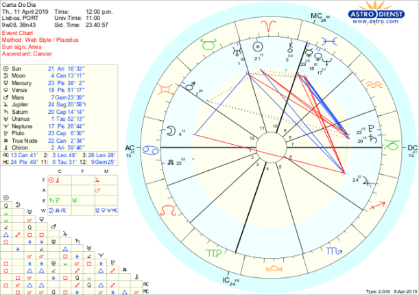 Temos também a Lua, que depois de fazer ontem, a partir do Gémeos, oposição a Júpiter antes de este entrar retrógrado– iluminado o debate e todas as opções que têm de ser revistas- entra hoje em Caranguejo, em sextil a Urano em Touro, fazendo apelo à introspecção e à busca de novas bases de segurança emocional, familiar, doméstica, nacional, até que se torne muito claro na sexta-feira à noite, quando a Lua fizer conjunção ao Nódulo Norte e oposição a Saturno e Plutão, que o caminho que vamos fazer de revisão têm como placa de destino uma nova maneira de olharmos para nós próprios e consequentemente a revisão dos planos de expansão futura.