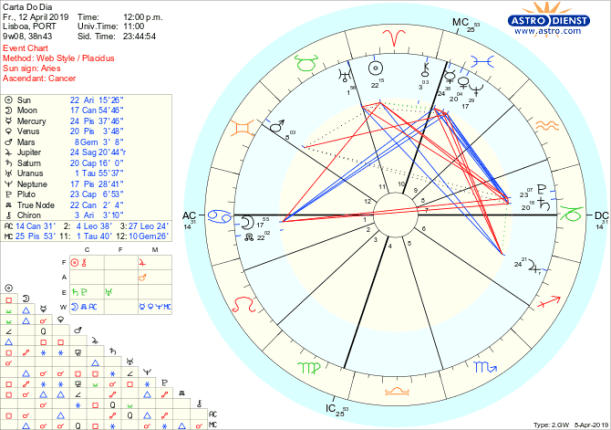 Hoje o desejo de acção sofre de falta de apoio com o Sol em Carneiro em quadratura à Lua conjunta ao Nódulo Norte em Caranguejo e quadrado a Saturno e Plutão em Capricórnio – perdurando este aspecto todo o fim-de-semana. Existe assim uma enorme tensão entre a vontade ou o poder de iniciativa e a necessidade de se encontrar novas bases de segurança emocional, familiar, nas tradições e rotinas ou nas situações nacionais. Porque o Nódulo Sul faz conjunção a Saturno e Plutão temos de reconstruir as estruturas de que dependemos, em casa, trabalho, país e com sentido prático descobrir como ter segurança face à inevitabilidade de novas circunstâncias de vida. A vontade cega é a atitude que só traz frustração e como Marte, regente do Sol em Carneiro, está em Gémeos a fazer aspectos difíceis de sesquiquadrado a Saturno e Plutão, semi-quadratura aos Nódulos e quadratura Neptuno, tudo o que dizemos sem reflexão choca com muros de pedra. Só as boas ideias, amor, compaixão, abertura e generosidade podem contribuir para suavizar a situação e sentirmos algum apoio nem que seja apenas o da consciência clara, com Mercúrio regente de Gémeos, conjunto a Venus e a Neptuno e em trígono à Lua e ao NóduloNorte e sextil a Plutão e Capricórnio.