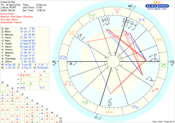 Estamos em véspera de Lua Cheia e caminhamos por isso para um extremar de posições, neste caso, porque o Sol está em Carneiro e a Lua em Balança, que se faz sentir entre as iniciativas que tomamos e o equilíbrio das relações. As tensões existentes são aliás muitas e já se fazem sentir há pelo menos uma semana, num crescendo, com o Sol em Carneiro a fazer quadratura a Saturno e a Plutão em Capricórnio e trígono a Júpiter em Sagitário e quadrado aos Nódulos lunares. Ou seja, o Fogo nos Ares, tudo o que proclamamos aos quatro ventos – porque Marte regente do Carneiro está em Gémeos, empolgado por acharmos que estamos a defender a verdade, choca com resistências, forças maiores, responsabilidades e ainda com o sentido do que de facto deve vir a ser a nova base de segurança, emocional, familiar ou nacional.
