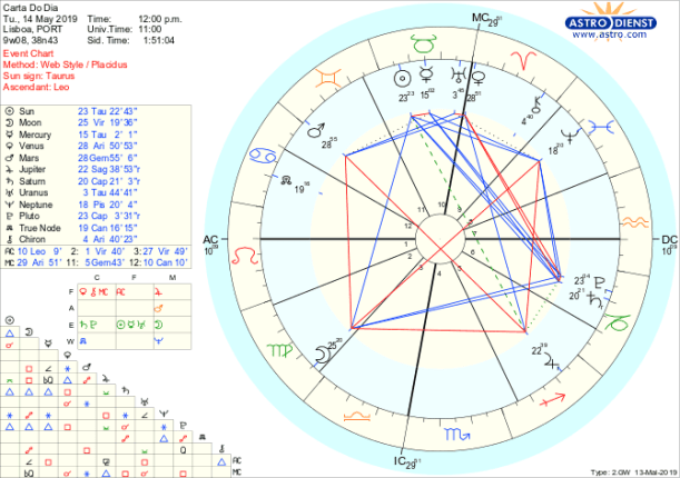 No final desta semana, no próximo sábado à noite, uma poderosa Lua cheia a 27 graus de Escorpião e Vénus recém entrada em Touro em conjunção a Urano e sextil a Marte já em Caranguejo trazem uma grande onda de emoções, surpresas e uma efervescência ou instabilidade a que temos de dar sentido e tentar equilibrar. É certo que ainda é apenas terça-feira mas quanto melhor nos prepararmos para essa agitação menos vamos padecer com o inesperado. Continua como pano de fundo a presença dos lentos Saturno e Plutão em Capricórnio, Urano em Touro, Neptuno em Peixes e Júpiter em Sagitário, todos excepto Urano retrógrados: estamos repensar como re-organizar as estruturas das nossas vidas, com que verdade e ideais e a abrir-nos para novos valores de forma a alcançarmos uma nova segurança emocional, doméstica, familiar, nacional, pela presença do Nódulo Norte em Caranguejo em oposição a Plutão e Saturno.