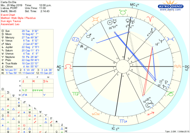 A semana começa com alguma confusão, aliás, um grande entusiasmo ao qual é preciso dar forma e futuro para que não seja apenas delírio ou sonho. Tudo que havia para nos surpreender e o clímax do que era preciso revalorizar já passou com a Lua Cheia do fim-de-semana. Encamihamo-nos agora para a Lua Nova de dia 3 de Junho sendo que, até lá, temos de tratar dos pendentes para que seja possível entrar numa nova fase de negociação, contactos, trocas, quando o Sol e a Lua se encontrarem em Gémeos.