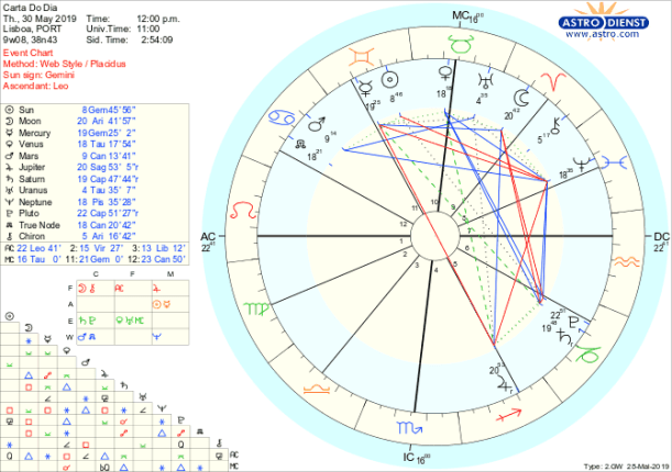 Fazer do pensamento acção é o grande apelo do dia num contexto em que comunicar é chave assim como organizar com pragmatismo o que valorizamos ou os investimentos em que queremos apostar, financeiros, materiais ou mesmo relacionais. A Lua em Carneiro apela a que tenhamos iniciativas e o seu trígono a Júpiter em Sagitário e sextil a Mercúrio em Gémeos- onde também está o Sol- diz-nos que temos hoje a oportunidade de exprimir os pensamentos que revelam a nossa Verdade, o caminho que julgamos ser o correcto para podermos evoluir. Em simultâneo, Vénus em Touro, hoje e todo o resto da semana, em trígono a Saturno e a Plutão em Capricórnio, permite que, com os pés bem assentes na Terra, reorganizemos mundos e fundos para com sucesso ganharmos nova estabilidade e recursos. Há no entanto de ter cuidado para evitar excessos de optimismo devido à oposição de Mercúrio a Júpiter e estar preparado para comunicações surpresa, de forma a com flexibilidade tirarmos o melhor partido das revelações que vierem da semi-quadratura de Mercúrio a Urano em Touro.