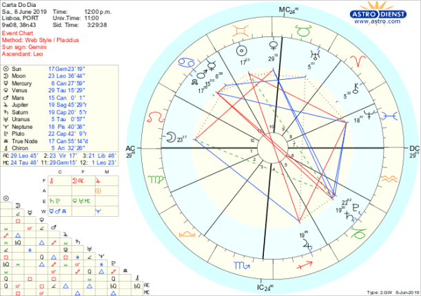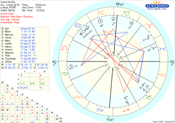 A frustração é ainda maior porque tanto sábado como domingo o Sol em Gémeos está oposto a Júpiter em Sagitário o que nos faz oscilar entre as grandes e pequenas expectativas, entre o perto e o longe, entre o ligeiro e o sábio, entre uma comunicação rápida e o aprofundamento da Verdade. O caminho a seguir passa por continuarmos a investir com inteligência e sentido prático na criação de novas bases de segurança, de um “ninho” emocional ou físico onde possamos ir buscar a energia para prosseguir para o futuro, tornando realidade um sonho de vida como indica Neptuno em Peixes em sextil a Saturno e Plutão em Capricórnio e trígono a Marte conjunto ao Nódulo Norte em Caranguejo. Mas não podemos tratar de assunto ou detalhe algum com ligeireza. O quincúncio do Sol a Saturno e quadratura a Neptuno obriga-nos todo o fim-de-semana a escolher as palavras e a clarificar ideias para não nos enganarmos nem a nós próprios nem aos outros. Já chegam as tensões vindas dos aspectos da Lua..