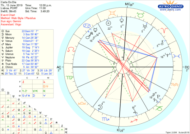 Encontrar um qualquer equilíbrio entre o passado e o futuro, cortando com estruturas caducas e abraçando uma nova lógica de estar e sentir é o desafio desta quinta feira em que Marte em Caranguejo conjunto ao Nódulo Norte faz oposição ao Nódulo Sul e a Saturno em Capricórnio e em que a Lua recém entrada em Escorpião- regida por Marte – se opõe a Urano em Touro fazendo-nos sentir que pouco controlamos mas que temos de gerir os nossos interesses o mais determinados possível… O Sol em Gémeos em quincúncio a Plutão em Capricórnio mostra-nos como é mais fácil falar do que agir e que há um esforço real a fazer para encontrar as palavras certas, sem hesitar nem baralhar. Este aspecto é reforçado pela presença de Vénus em Gémeos, em quincúncio à Lua e sesquiquadrado a Saturno, mais sinais de que não podemos ter simultaneamente um pé num lado e no lado oposto. De facto, o único controlo que podemos ter é sobre nós próprios, analisando opções mas tomando as decisões que melhor se nos sirvam para o futuro.