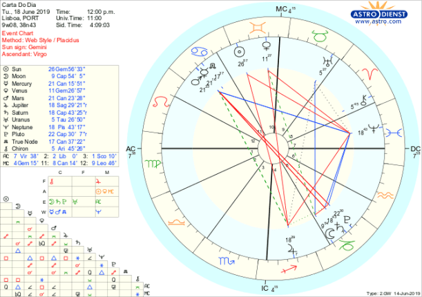 Hoje e amanhã são dias de comunicações e sentimentos intensos em que a desordem aparente tem de ser transformada em algo de securizante. É a nossa segurança emocional, familiar, doméstica ou nacional que está em jogo e é a lógica dessa defesa que nos impele a procurar uma outra ordem estruturante, desafiando limites e responsabilidades antigos ou poderes estabelecidos. O Sol está em Gémeos o que põe o foco na troca de informações mas toda a comunicação – Mercúrio – está sob a força da defesa dos interesses da “casa” emocional” ou física , pela sua conjunção a Marte e ao Nódulo Norte em Caranguejo. Para que isto aconteça temos de reformular a nossa realidade estrutural o que é simultaneamente uma ambição e uma ansiedade e um processo de transformação emocional com a Lua em Capricórnio hoje conjunta a Saturno e ao Nódulo Sul e amanhã a Plutão. O sextil de Saturno a Neptuno e o trígono ao Nódulo Norte é o garante de que com pragmatismo e sentido de futuro conseguimos dar forma ao sonho.
