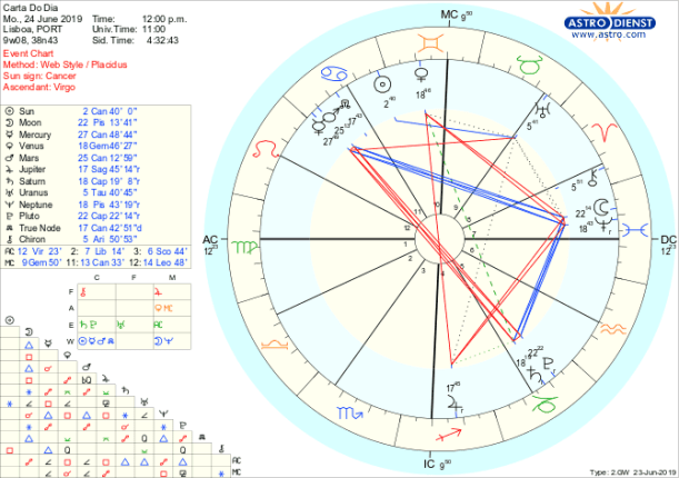 O desejo de estar numa bolha de fantasia, conforto ou sonhos de segurança e domesticidade é grande neste arranque de semana mas isso não quer dizer que não sejamos capazes de dar forma a essas aspirações com sentido prático e noção de oportunidade. Com o Sol, Nódulo Norte Marte e Mercúrio em Caranguejo, é para a casa, família, questões de interesse pessoal ou de defesa nacional que estão viradas as nossas mais fortes energias como a vontade, o sentido de futuro e a lógica de comunicação ou negócio. A Lua que rege o Caranguejo está em Peixes, conjunto a Neptuno e em trígono a todos os planetas de Caranguejo excepto o Sol, no que representa uma hiper sensibilidade a todas essas questões, intuição e fantasia, potencialmente exageradas pela quadratura a Júpiter em Sagitário. Para nos dar a possibilidade de tratar dos assuntos práticos que permitem desmistificar e concretizar o possível, temos um sextil da Lua e de Neptuno a Saturno e Plutão em Capricórnio, aspecto que se bem trabalhado permite à Lua ou seja às nossas carências e receios construir bases mais sólidas de segurança emocional, em casa ou no país. Podemos sonhar mas temos de dar forma ao sonho.