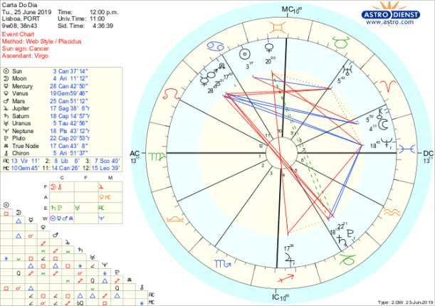 Desejamos que as coisas aconteçam que haja iniciativas satisfatórias mas a motivação acaba por ser travada pela cautela ou por resistências e de facto não é dia para grandes aventuras, melhor arrumar assuntos e reflectir sobre como inovar de futuro, tendo já em vista a Lua Nova e Eclipse total do Sol em Caranguejo, no próximo dia 2 de Julho. Até lá, vamos ter a Lua a passar por Carneiro, Touro e Gémeos e hoje está em Carneiro onde faz conjunção a Quíron pondo o dedo na ferida do desejo de acção insatisfeito. A Lua rege o Caranguejo onde transitam o Sol, o Nódulo Norte, Marte e Mercúrio, energias de vontade, destino e lógica para a criação de novas bases de segurança emocional, doméstica ou nacional. Que fazer para que isso aconteça? É isso que hoje nos questionamos, sentindo alguma frustração dada a conjunção da Lua ao Quíron e suas quadraturas ao Sol em Caranguejo. A complicar tudo, uma semi-quadratura de Vénus em Gémeos a Urano em Touro baralha as escolha de novas opções, pode estabilizar o que estiver de novo em marcha e causar ansiedade. É um dia para ter calma e não desejar que tudo se resolva de imediato.